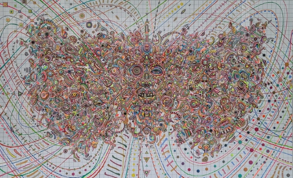 작품 속 서로 다른 두상들은 미세한 어긋남과 반복 속에서 하나의 얼굴로 정리되지 않은 채 공존한다. 배경의 격자와 방사형 선들은 두상들의 배열을 좌표화하고 관계를 가시화하며, 복수의 다이어그램이 중첩된 화면을 이룬다.